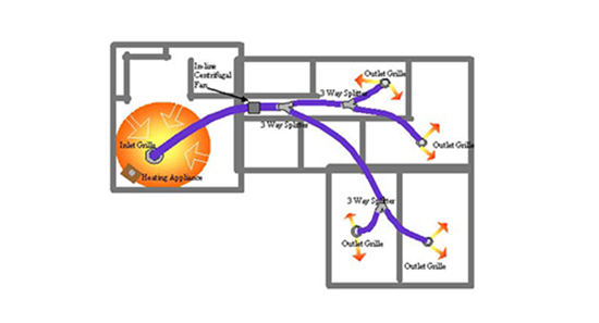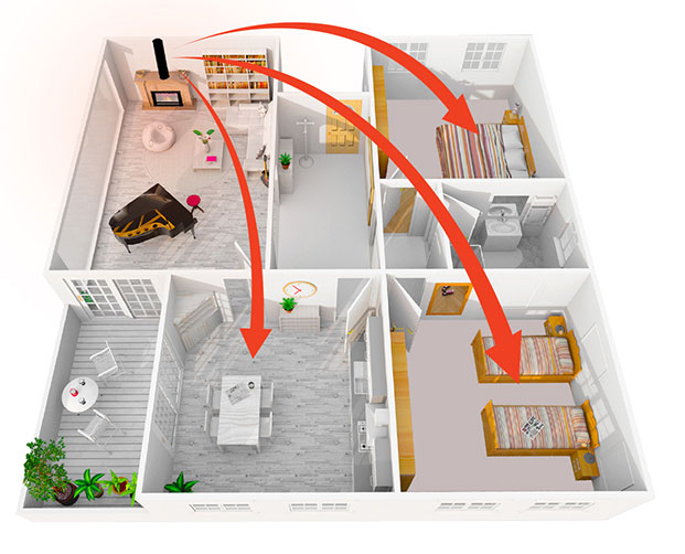 Use the excess capacity of your heat source to warm other rooms in your home. An average size lounge requires 2-4 kw of heating, yet heating appliances such as log burners and pellet fires* can generate 10-20kw. That’s 5 times the amount of heat required for a lounge room. This leaves an excess of 8-16 kw of heat available to warm other rooms in your home. Air trapped at ceiling level can reach temperatures in excess of 30°C so.