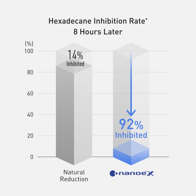 *(1) Testing method: Measured the amount of attached organic substances in an approximately 802 m³ sized test room. (2) Inhibition method: nanoe X Generator Mark1 released. (3) Test substance: Hexadecane (4) Test result: Inhibited 92% in 8 hours (ETRC257/16/1402 (R479/19))