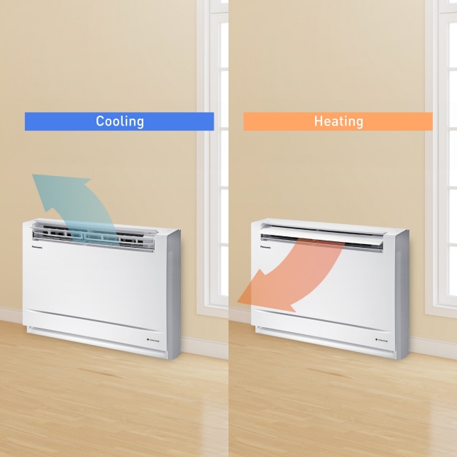 The unit creates a comfortable space by using different airflows for cooling and heating. When cooling, upward air flow efficiently cools the entire room. When heating, upward and downward air flow warms the whole room uniformly.